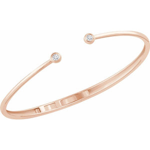 • A simplistic design with timeless style featuring 2 white diamonds bezel-set in polished 14k rose gold. This hinged cuff bracelet is approximately 4mm (3/16 inch) in width by 7 inches in circumference. The natural diamonds are I1 in clarity, H-I in color and the total carat weight is 1/6. This is a made to order item and is estimated to ship in about 6-8 days. Please email service@theblackbow.com for more details.
