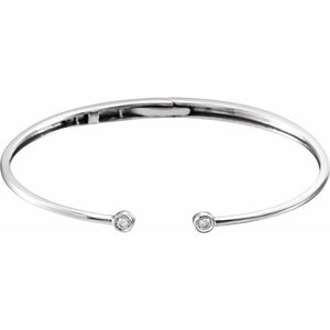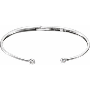 • A simplistic design with timeless style featuring 2 white diamonds bezel-set in polished rhodium-plated 14k white gold. This hinged cuff bracelet is approximately 4mm (3/16 inch) in width by 7 inches in circumference. The natural diamonds are I1 in clarity, H-I in color and the total carat weight is 1/6. This is a made to order item and is estimated to ship in about 6-8 days. Please email service@theblackbow.com for more details.