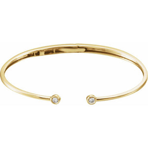 A simplistic design with timeless style featuring 2 white diamonds bezel-set in polished 14k yellow gold. This hinged cuff bracelet is approximately 4mm (3/16 inch) in width by 7 inches in circumference. The natural diamonds are I1 in clarity, H-I in color and the total carat weight is 1/6.