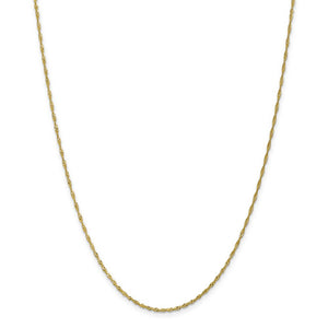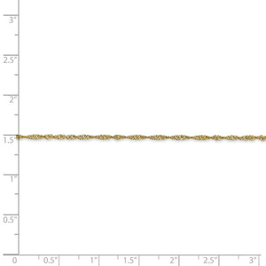 Known for its unique twisted design this 1.4mm width, 24-inch long Singapore chain features a solid link construction with a high polished finish that catches the light with every movement. It is fashioned from 10k yellow gold and closes with a spring ring clasp.