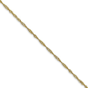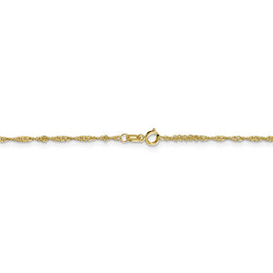 Known for its unique twisted design this 1.4mm width, 18-inch long Singapore chain features a solid link construction with a high polished finish that catches the light with every movement. It is fashioned from 10k yellow gold and closes with a spring ring clasp.