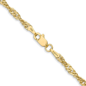 Known for its unique twisted, diamond-shaped link design this 2.75mm width Singapore necklace chain features a lightweight, hollow link construction with a gleaming polished finish that catches the light with every movement. It is fashioned from 14k yellow gold with a reliable lobster claw clasp. 18-inch length
