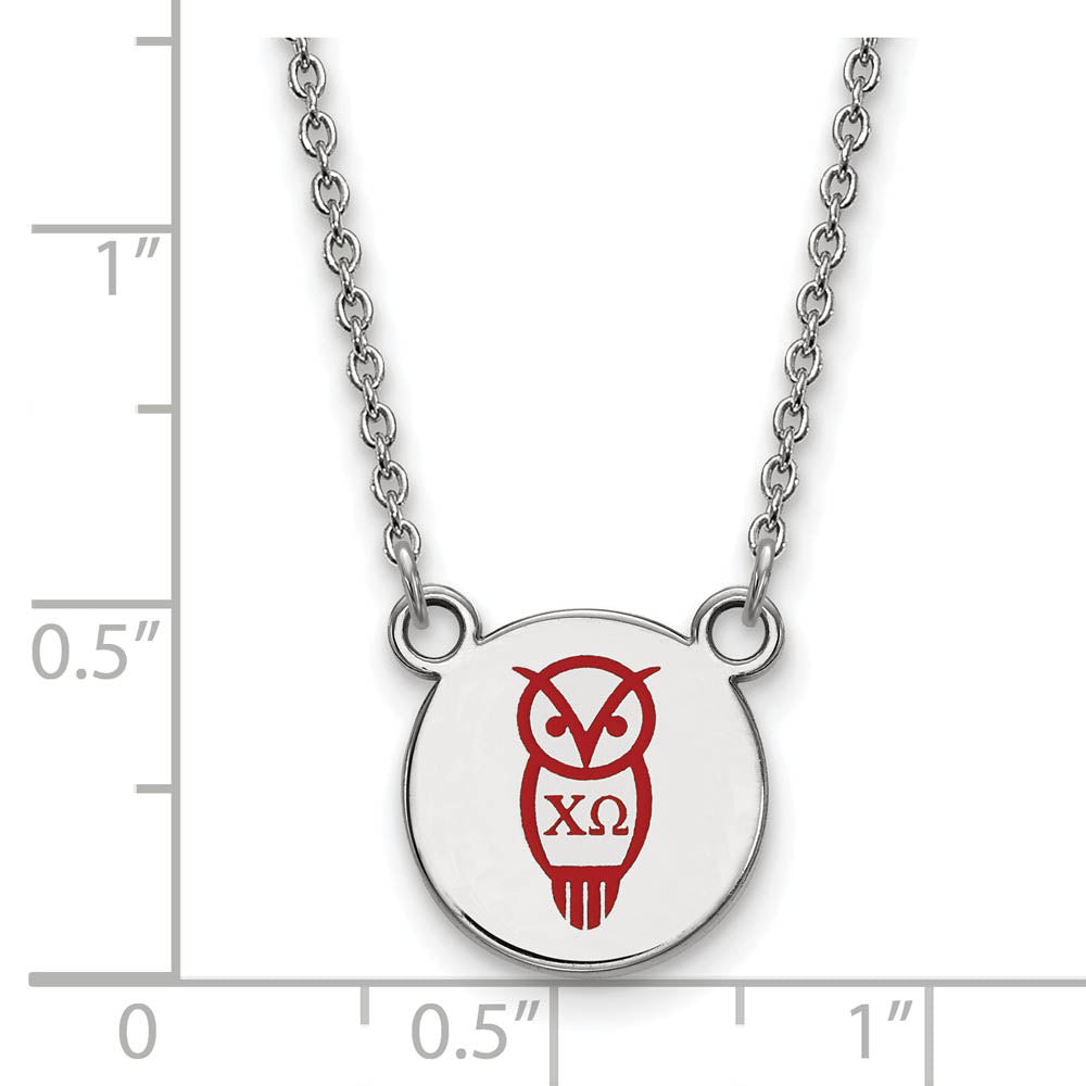 Show your greek life spirit with this Chi Omega Sorority necklace. It is crafted with rhodium plated sterling silver and is 18 Inches in length. The pendant is 12mm in width and 12mm in height (0.47 in x 0.47 in) and dangles from a 1.25mm wide cable chain. We are a certified Collegiate jewelry retailer and this authentic item is licensed by the Chi Omega Sorority and Greek Life. This enameled pendant necklace is made the USA.