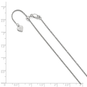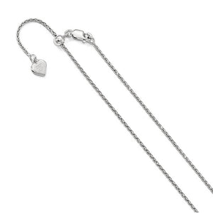 This sterling silver spiga chain features a three-dimensional diamond-cut braided design that is a bit more flexible than a classic wheat style, a tarnish resistant rhodium-plated finish, and a slide mechanism with a lobster clasp. It measures 1.1mm in width and is adjustable in length up to 30 inches. Made in Italy.