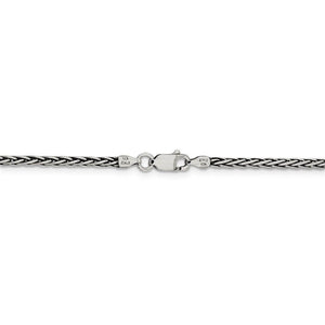 • Strands of sterling silver are woven together to create a spectacular square braided pattern for this 2.25mm width, 22-inch long chain that closes with a lobster-claw clasp. It features a solid link design and an oxidized finish that gives it a striking mixture of tone and texture.