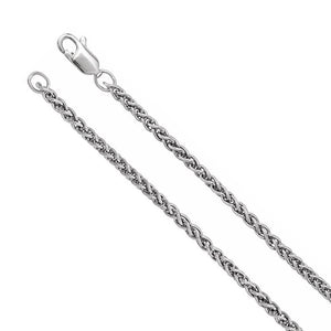 Spiga or Wheat Chains are made with small figure-eight shaped links that all point in the same direction forming a 3-D chain that exhibits a v-pattern on the side. While this style is not as flexible or liquid-like as some other styles, it does a great job complementing your favorite pendant or worn solo. This one is created from tarnish-resistant rhodium-plated sterling silver gold and features a solid link construction with a lobster claw clasp. It is approximately 2.4mm in width by 18-inches in length.