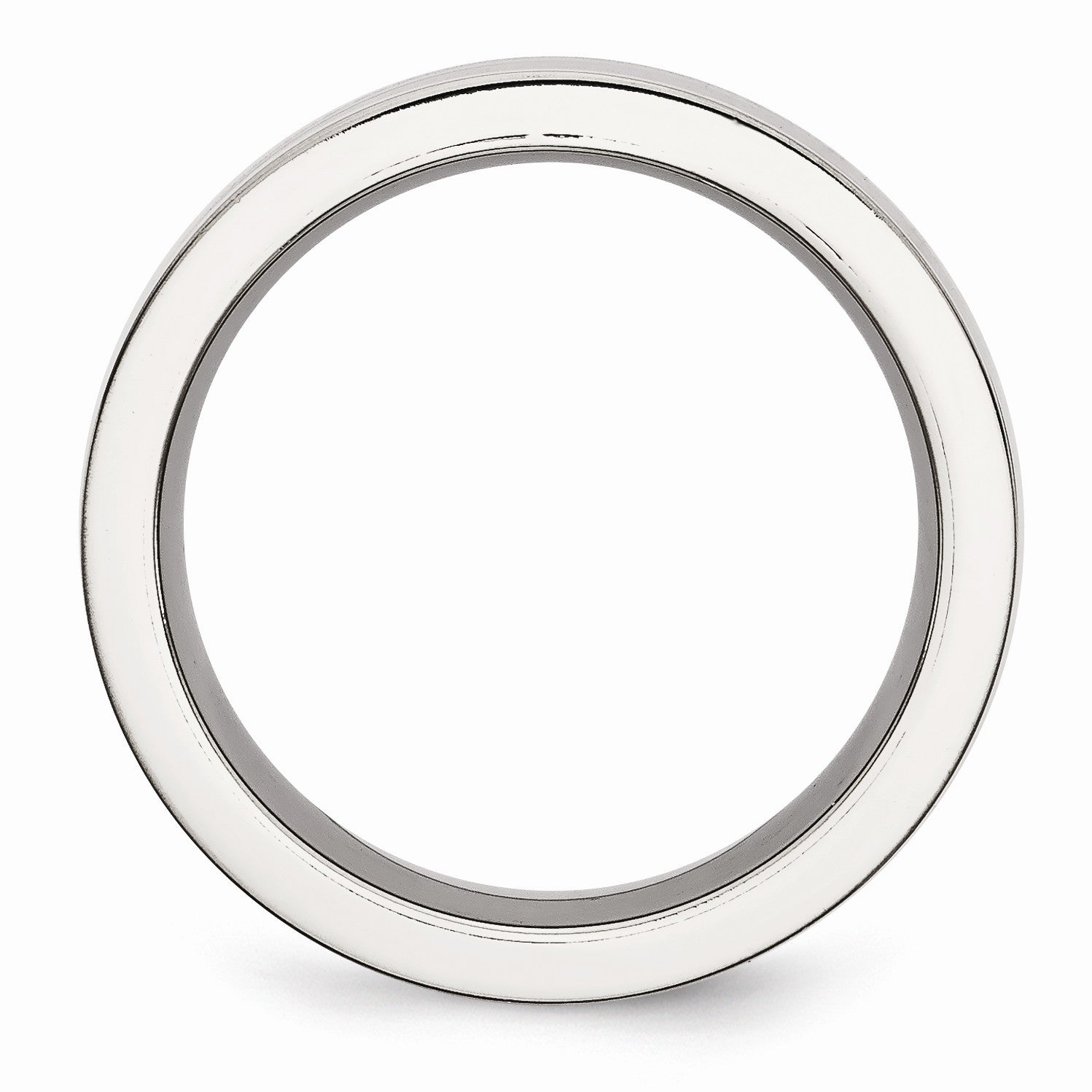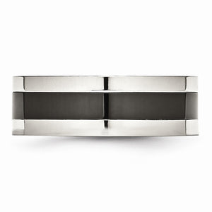 The bold sleek styling of this polished stainless steel ring features a flat profile with a center stripe of smooth black ceramic. It measures 8mm in width, has standard fit shank and is suitable for engraving.