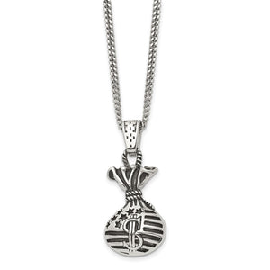 Show off your winning personality with this antiqued stainless steel necklace featuring a stars and stripes money bag pendant that is approximately 21mm (13/16 inch) in width by 46mm (1 3/4 inch) in length, which includes the bail. It hangs on a 2.5mm width by 22-inch-long polished curb chain that closes with a fancy lobster clasp.