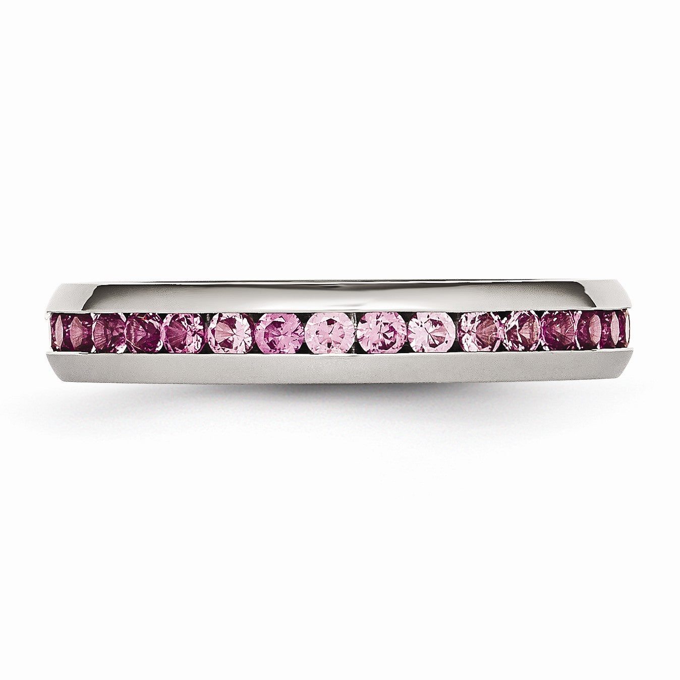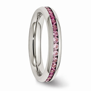 Wear alone or mix with other stack rings to create your own look! This 4mm eternity band fashioned from polished 316L stainless steel is channel set with dark pink cubic zirconia gemstones all the way around.