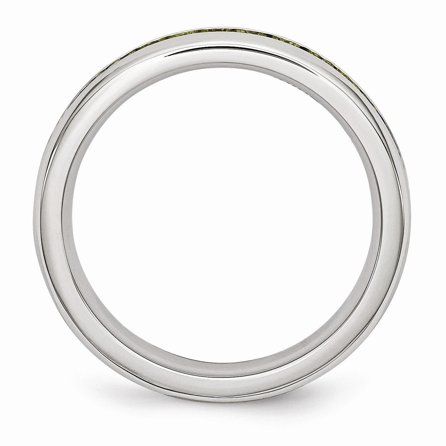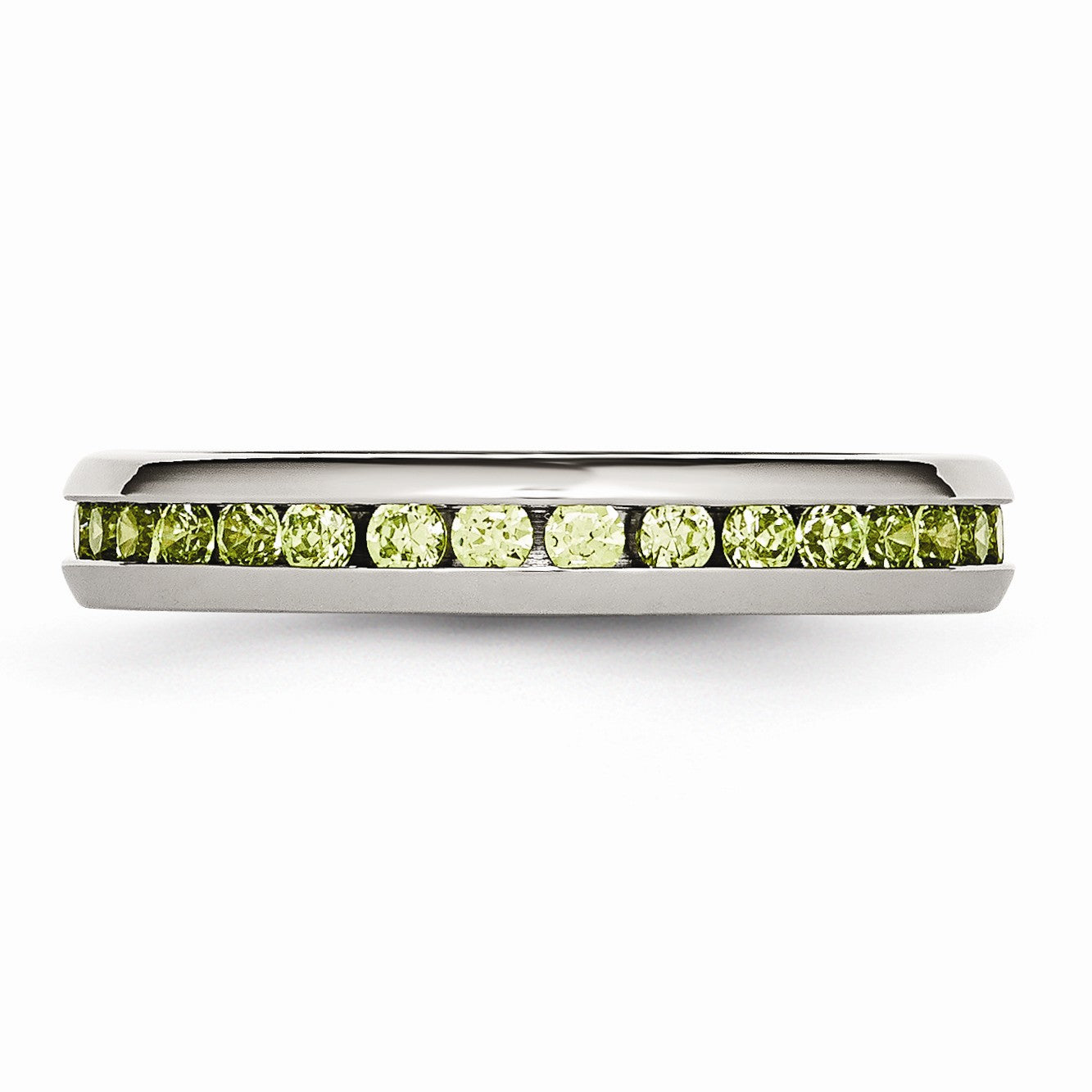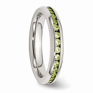Wear alone or mix with other stack rings to create your own look! This 4mm eternity band fashioned from polished 316L stainless steel is channel set with light green cubic zirconia gemstones all the way around.