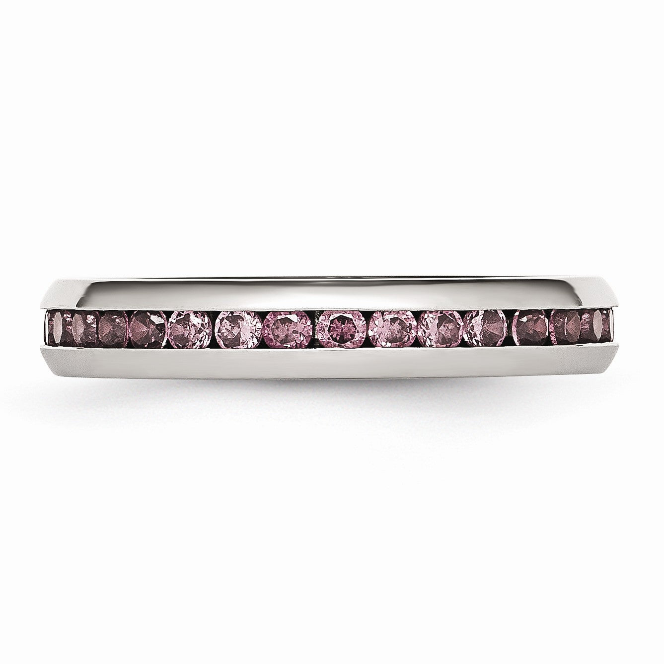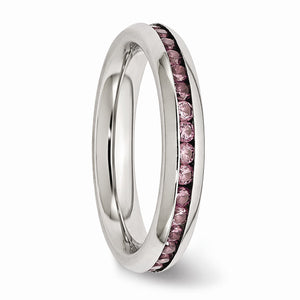 Wear alone or mix with other stack rings to create your own look! This 4mm eternity band fashioned from polished 316L stainless steel is channel set with pink cubic zirconia gemstones all the way around.