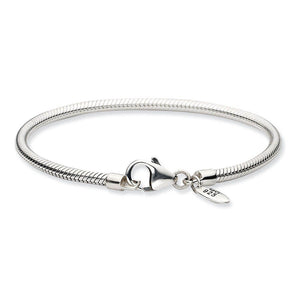 Get started designing your own charm bracelet masterpiece with this sterling silver, 3mm width, 7.5 inch long, solid snake chain bracelet that is finished with a fancy lobster clasp. It is compatible with all popular brands of bead style charms with a 4mm or larger core and beads simply slide onto the end of the chain. For correct bracelet length, measure your wrist and add an extra 1 to 1 1/2 inches to allow for width of bead.