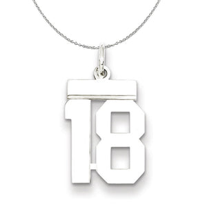 Celebrate your favorite sports player, lucky number or milestone date in your life with a prominent rhodium-plated sterling silver charm. Each polished number is approximately 13mm (1/2 Inch) in length, which is finished with a 2mm top bar and a classic jump ring that will accommodate up to a 3mm chain. Includes an 18 inch, 1.25mm sterling silver cable chain with a lobster clasp closure.