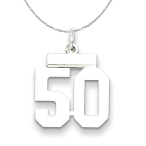 Celebrate your favorite sports player, lucky number or milestone date in your life with a prominent rhodium-plated sterling silver charm. Each polished number is approximately 13mm (1/2 Inch) in length, which is finished with a 2mm top bar and a classic jump ring that will accommodate up to a 3mm chain. Includes a 20 Inch, 1.25mm sterling silver cable chain with a lobster clasp closure.