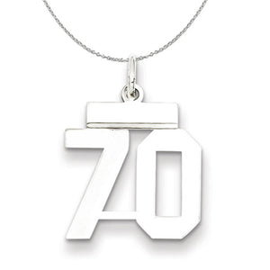 Celebrate your favorite sports player, lucky number or milestone date in your life with a prominent rhodium-plated sterling silver charm. Each polished number is approximately 13mm (1/2 Inch) in length, which is finished with a 2mm top bar and a classic jump ring that will accommodate up to a 3mm chain. Includes a 24 inch, 1.25mm sterling silver cable chain with a lobster clasp closure.