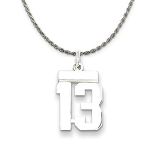 Celebrate your favorite sports player, lucky number or milestone date in your life with a prominent rhodium-plated sterling silver charm. Each polished number is approximately 18mm (11/16 inch) in length, which is finished with a 2mm top bar and a classic jump ring. Includes a flexible and strong diamond cut rope chain. This stunning chain is 2.25mm in width, 18 inches in length and features a sturdy lobster claw clasp. The chain is crafted in Italy.