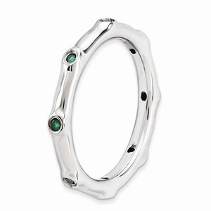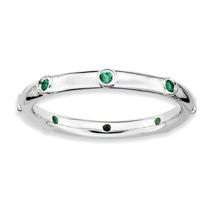 Created Emerald, May's birthstone symbolizes luck, creativity and well-being bringing wisdom and reason. This 2.5mm wide band fashioned from rhodium plated sterling silver is bezel set with 1. Mm round synthetic gemstones totaling 1/10 of a carat based on a size 7. Guaranteed to fit together perfectly with all of the mix and match Stackable Expressions rings.