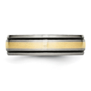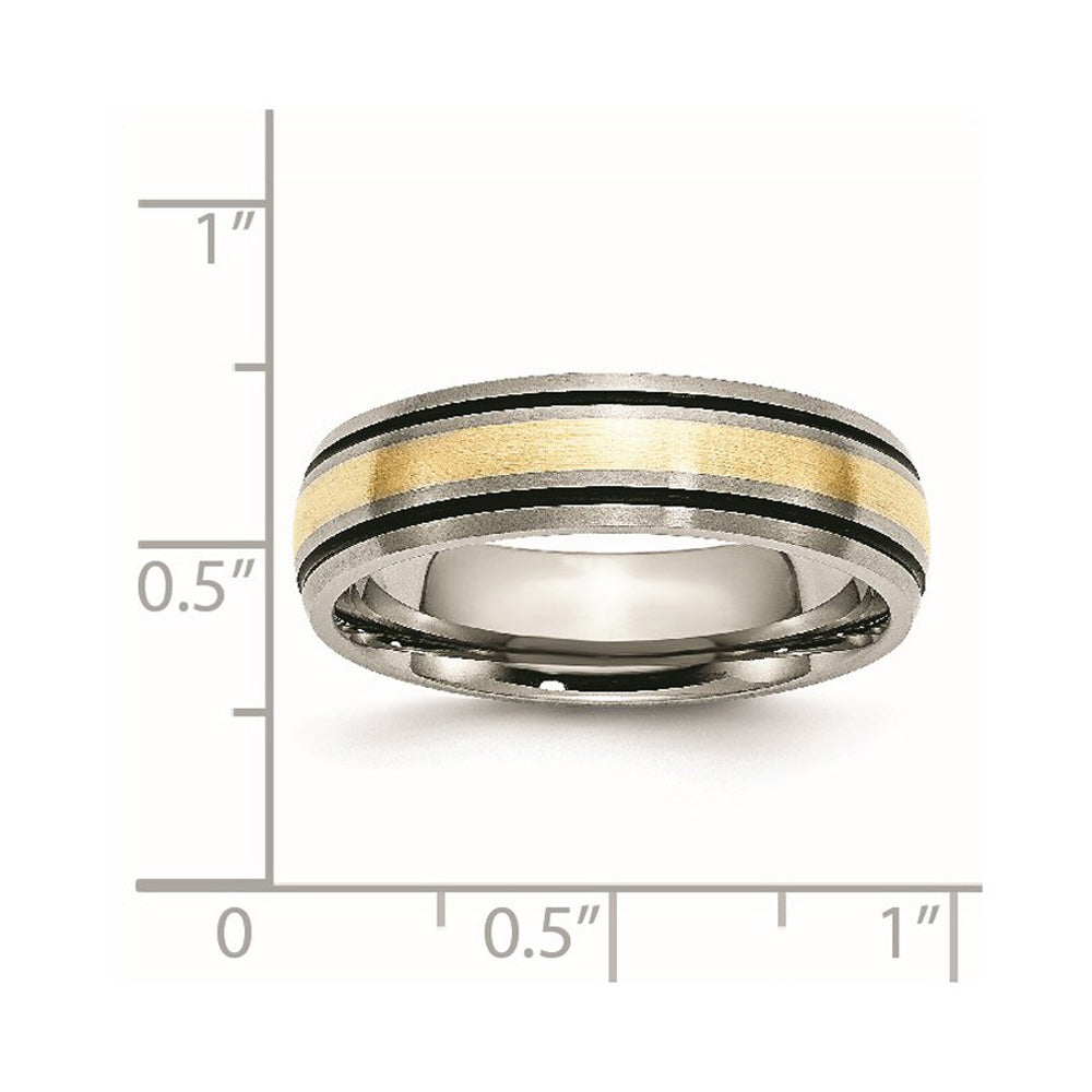 Distinctive style featuring a domed shape, a 14k yellow gold inlay center with a brushed finish, antiqued grooves, and a polished standard fit shank created from titanium. This 6mm width, three-tone, unisex band is suitable for engraving.�