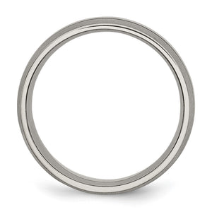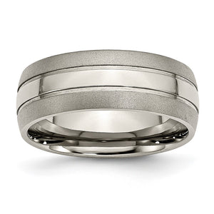 Simply striking, a distinctive style made from titanium featuring a polished grooved center with satin finished edges. This unisex standard-fit band is approximately 8mm in width and suitable for engraving. Titanium rings are durable, hypoallergenic, and lightweight.