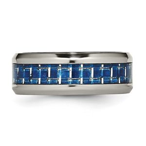 A trendy modern design featuring a flat center inlaid with blue/white carbon fiber and a polished beveled edges created from durable titanium. This comfort-fit band is approximately 8mm in width and is suitable for engraving.