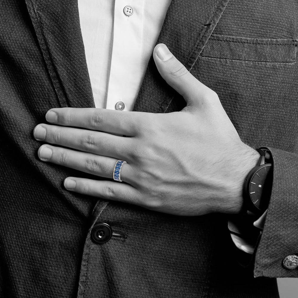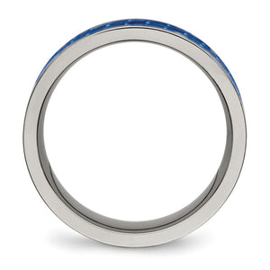 A trendy modern design featuring a flat center inlaid with blue/white carbon fiber and a polished edges created from durable titanium. This comfort-fit band is approximately 8mm in width and is suitable for engraving.