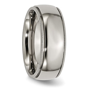 Titanium's beautiful lustrous color combined with its versatile properties makes it a superb choice for those who want a ring that will endure the test of time. This 8mm width, standard-fit, unisex band features a polished finish, a half-round center with grooved and milgrain edges. Suitable for engraving.