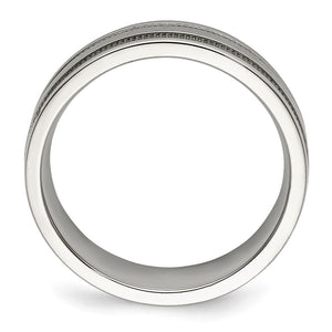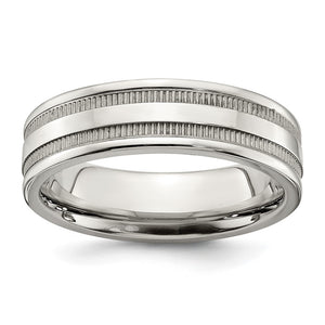 Refine your style with a distinctive ring crafted from 316L stainless steel that mirrors your unique personality. This 6mm width men's band features a polished and coin edge grooved design, and a standard fit shank. Suitable for engraving.
