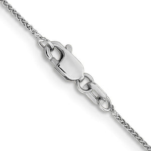 Made with small figure-eight shaped links that all point in the same direction forming a 3-D chain that has an almost square, plaited profile. This polished spiga-wheat chain anklet is created in rhodium-plated 14k white gold, features a polished solid link design that is 0.8mm in width by 9-inches in length and closes with a lobster claw clasp.