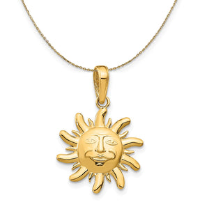 Solar fun, this flaming sun charm features a happy face design fashioned from 14k yellow gold with a satin and diamond-cut finish. It is approximately 15mm (9/16 inch) in width by 22mm (7/8 Inch) in length, which includes the tapered bail. Includes a 16 inch long, 0.9mm wide, solid 14k yellow gold cable chain with a spring ring clasp.