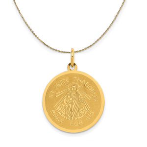St. Jude Thaddeus, patron saint of hospitals and desperate causes. Crafted from 14 karat yellow gold with a laser etched design. Charm measures 3/4 Inch in diameter and is suitable for engraving. Includes a 24 inch long, 0.9mm wide, solid 14k yellow gold cable chain with a spring ring clasp.