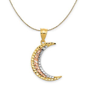 Diamond-cut facets twinkle throughout the design of this crescent moon pendant fashioned from 14k yellow and rose gold with white rhodium plating. The approximate size is 14mm (9/16 inch) in width by 27mm (1 1/16 inch) in length, which includes the tapered bail. Includes a 18 inch long, 0.9mm wide, solid 14k yellow gold cable chain with a spring ring clasp.