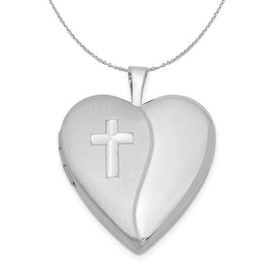 Show off your loved ones and keep them close with this 20mm sterling silver heart locket featuring a Latin cross and dual finished design. Opens to hold two small photos or keepsakes and is suitable for hand engraving only. Includes a 1.25mm, 16 inch sterling silver cable chain.