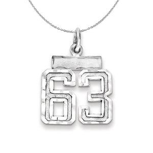Celebrate your favorite sports player, lucky number or milestone date in your life with a prominent rhodium-plated sterling silver charm. Each satin and diamond cut number is approximately 12mm (7/16 Inch) in length, which is finished with a 3mm top bar and classic jump ring that will accommodate up to a 3mm chain. Includes a 1.25mm, 20 inch sterling silver cable chain.