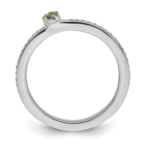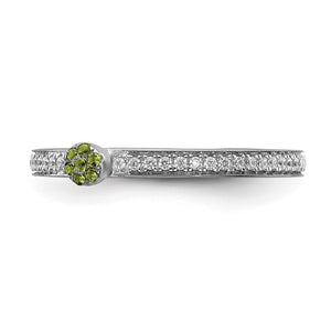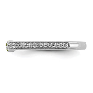 Make it simple and stylish with bands of different textures, finishes, widths and colors or extravagant with diamonds and gemstones! This stackable ring created from rhodium-plated 14k white gold features 7 genuine peridot gemstones totaling 1/15 of a carat and 24 genuine diamonds totaling 1/8 carat. The natural diamonds are I2 in clarity and I-J in color. The color range varies on all genuine gemstones so please allow for slight variations in shades (light to medium yellowish green). The color on your screen may also not reflect actual gemstone color due to variations in monitors. The approximate band width is 2mm and the top head width is 3mm. Guaranteed to fit together perfectly with all of the mix and match Stackable Expressions rings.