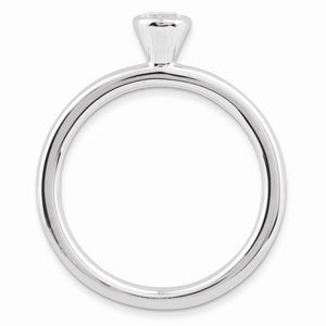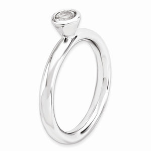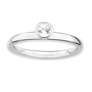 White Topaz, April's birthstone is known as the stone of power, healing and protection; increasing awareness of thoughts and deeds. This 2.5mm band fashioned from rhodium plated sterling silver is bezel set in a high profile mounting with a 4mm round gemstone that will stand out and make a statement. Guaranteed to fit together perfectly with all of the mix and match Stackable Expressions rings.