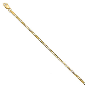 Round and oval links made of polished 14k yellow gold interlock in a reoccurring three and one pattern that closes with a lobster claw clasp. The easy elegance of a flat Figaro chain looks great with dress or casual wear and the 1.8mm width is perfect on its own or paired with other chains for a layered look. 8-inch bracelet length
