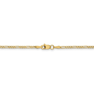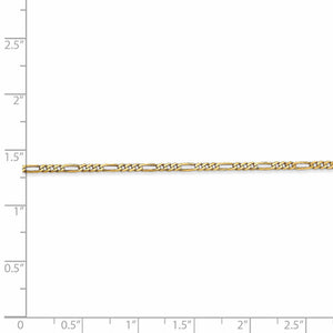 Round and oval links made of polished 14k yellow gold interlock in a reoccurring three and one pattern that closes with a lobster claw clasp. The easy elegance of a flat Figaro chain looks great with dress or casual wear and the 1.8mm width is perfect on its own or paired with other chains for a layered look. 7-inch bracelet length