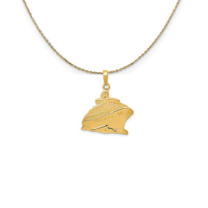 • Recall a special vacation memory or inspire a new one with this cruise ship crafted from polished 14k yellow gold. The 2-dimensional pendant measures approximately 20mm (3/4 Inch) wide by 26mm (1 Inch) long, which includes the tapered bail. Includes a 20 inch long, 0.9mm wide, solid 14k yellow gold cable chain with a spring ring clasp.