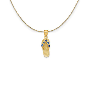 Bring summertime glam with a splash of color to every occasion with this cubic zirconia flip-flop pendant fashioned from polished 14k yellow gold. It measures approximately 7mm (1/4 Inch) wide by 25mm (1 Inch) long, which includes the tapered bail. Includes a 16 inch long, 0.9mm wide, solid 14k yellow gold cable chain with a spring ring clasp.