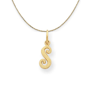 Initial attraction in a textured fancy script design fashioned from satin finished 14k yellow gold. Each miniature upper case letter is approximately 10mm (3/8 Inch) in length and dangles from a classic jump ring. The pendant is Includes a 16 inch, 0.8mm 14k yellow gold cable chain with a lobster clasp.
