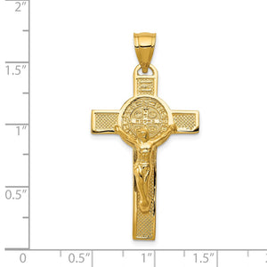 Celebrate and honor all special occasions with jewelry of religious significance! Our collection of spiritually inspired designs that show faith, hope and devotion are perfect for commemorating life's milestones. This medium San Benito crucifix cross (Spanish, St. Benedict), patron saint of Europe, students and agricultural workers, crafted in 14k yellow gold features a solid, 2-sided, polished design. The approximate size is 19mm (3/4 inch) in width by 32mm (1 1/4 inch) in length with the bail. This item does not include a chain.
