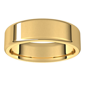 Sleek and simple with a polished flat profile designed from 14k yellow gold. This standard weight 6mm width band also features a rounded edge and comfort fit or rounded interior so it will not cut into your finger. Approximate thickness 1.5mm. Suitable for engraving. Made in the USA This is a made to order item and is estimated to ship 11/27/2025