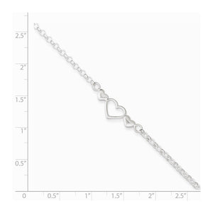 Flirty and feminine, this triple heart bracelet will wrap around your ankle with elegant sensuality. It is designed from polished sterling silver, features a 2mm width solid link rolo chain finished with a spring ring clasp and is adjustable in length from 9 to 10 inches. The open heart in the center is approximately 7mm in width.