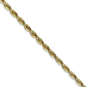 Spiraling rope chains made of 10k yellow gold enhanced with diamond-cuts are extremely popular because they offer a classic design with maximum shine. Flexible and strong, this lightweight solid link, necklace chain is approximately 2.8mm in width by 18-inches in length and closes with a lobster-claw clasp.