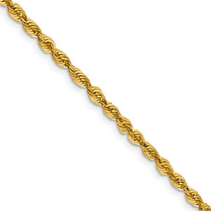 Spiraling rope chains made of 10k yellow gold enhanced with diamond-cuts are extremely popular because they offer a classic design with maximum shine. Flexible and lightweight, this 3mm width, 22-inch long hollow link necklace chain fastens with a lobster claw clasp.