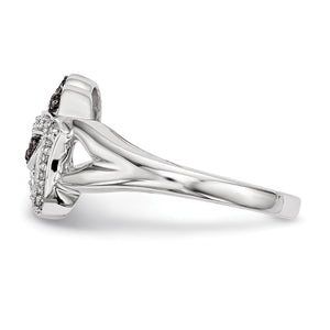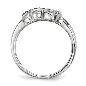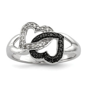 Opposites do attract! Like the sparkle of the stars in the dark night sky, this black and white diamond double heart ring matches that beauty. Designed from tarnish resistant rhodium sterling silver and prong set with H-I natural white and black heat-treated, I2-I3 clarity diamonds totaling 1/8 carat. It features a split shank, tapered fit that is approximately 11mm (7/16 inch) in width across the top and 2mm in width at the bottom. Available in whole sizes 6-8 only.