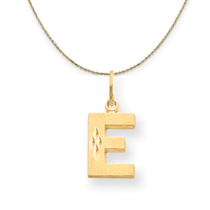 Create a sparkling initial impression with this satin finished 14k yellow gold charm featuring diamond cut accents that twinkle with every movement. Each letter measures approximately 12mm (7/16 Inch) in length and dangles from a classic jump ring. The pendant is . Includes a 22 inch, 0.8mm 14k yellow gold cable chain with a lobster clasp.