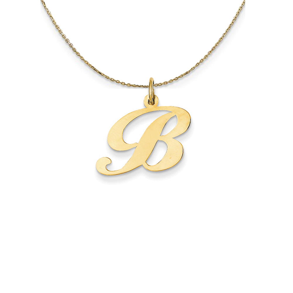 Indulge in a traditional initial charm that subtly enhances and personalizes your jewelry. Each fancy script letter is approximately 19mm (3/4 inch) in length, fashioned from 14k yellow gold with a high polished finish and includes a standard jump ring. Includes a 20 inch long, 0.9mm wide, solid 14k yellow gold cable chain with a spring ring clasp.