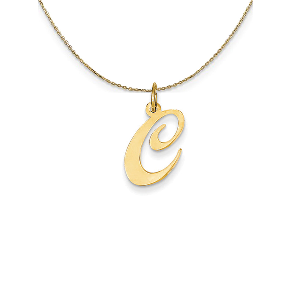 Indulge in a traditional initial charm that subtly enhances and personalizes your jewelry. Each fancy script letter is approximately 19mm (3/4 inch) in length, fashioned from 14k yellow gold with a high polished finish and includes a standard jump ring. Includes a 20 inch long, 0.9mm wide, solid 14k yellow gold cable chain with a spring ring clasp.