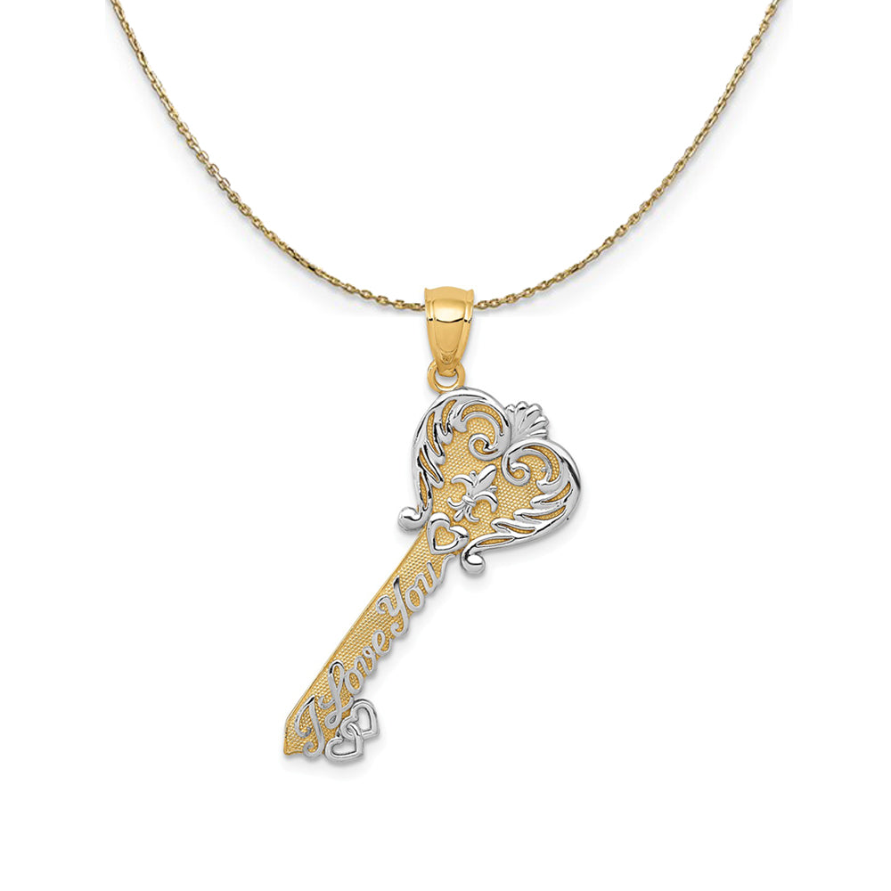 • This I love you key pendant is crafted from 14k yellow gold with white rhodium and it features a polished and textured design with hearts and a fleur de lis. The approximate size is 13 mm x 40 mm and its average item weight is 1.32 grams. Includes a 18 inch long, 0.9mm wide, solid 14k yellow gold cable chain with a spring ring clasp.